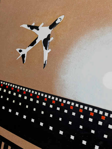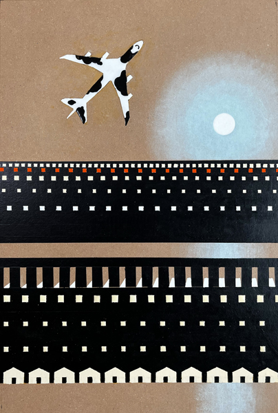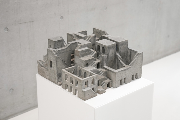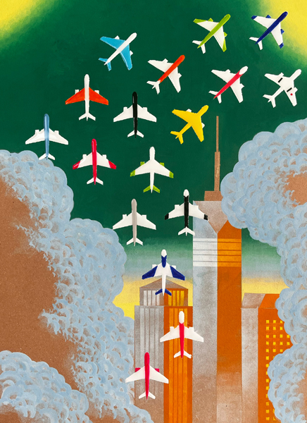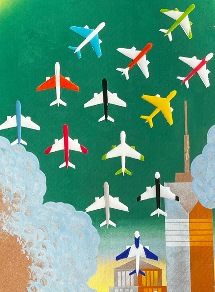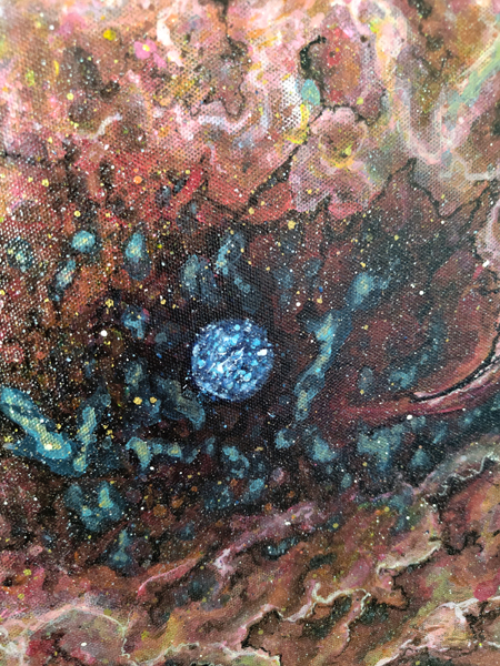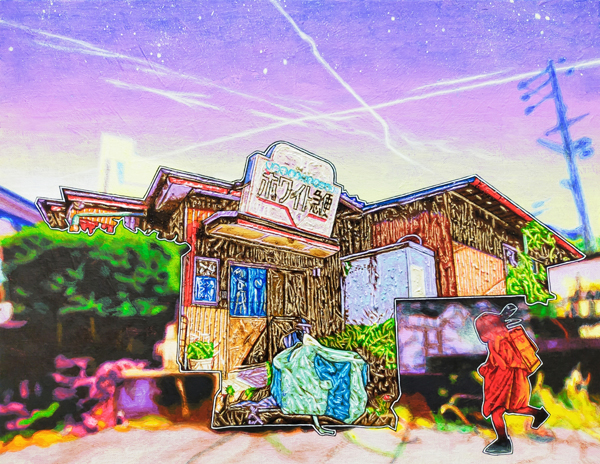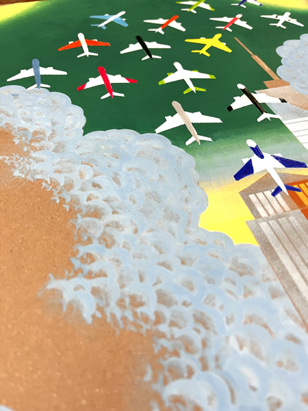 鳥が飛び交う窓のある構造物と、宇宙空間がつながることで、現実と非現実のあわいを捉え、「今ここ」という身体感覚と、広がりゆく意識の両立を表現しました。