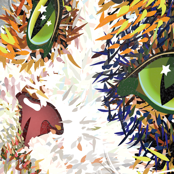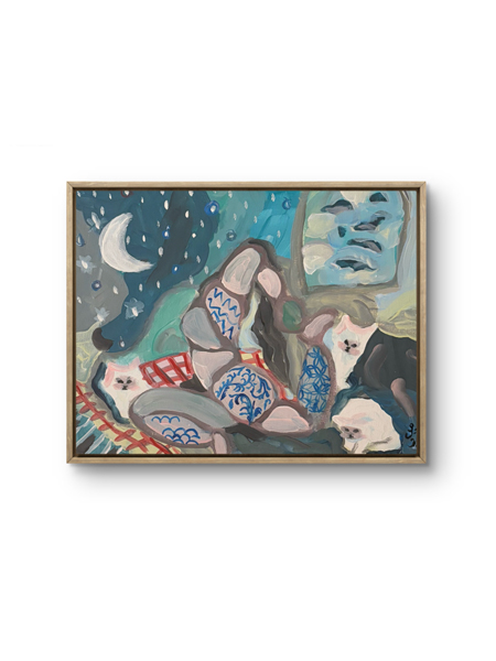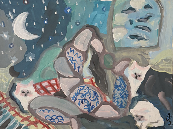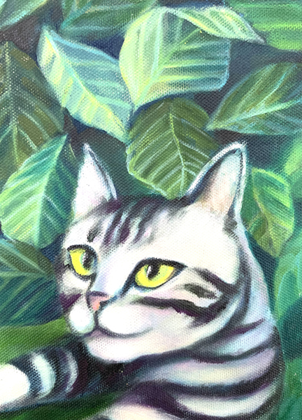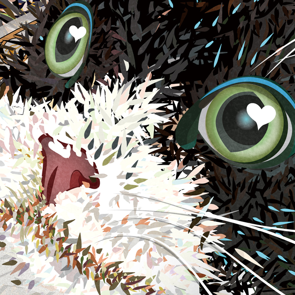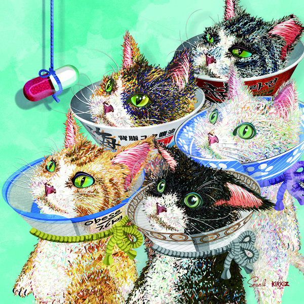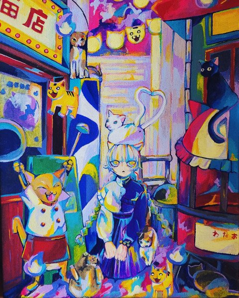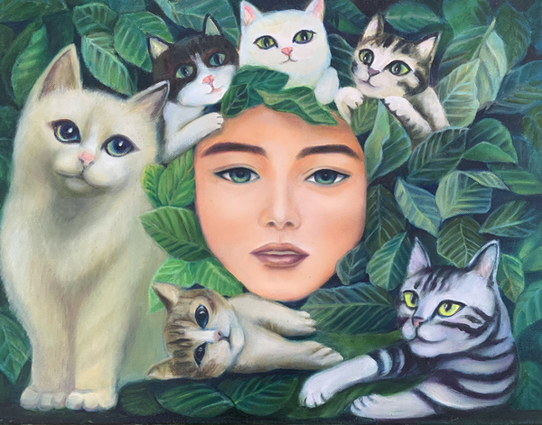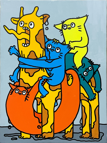 ヨガを行う人物と、その周囲で自由気ままに過ごす子猫たちを描いた作品です。