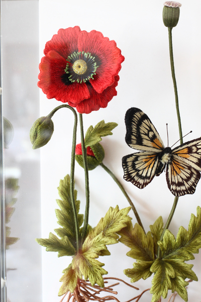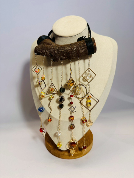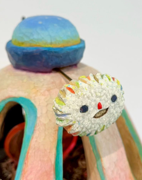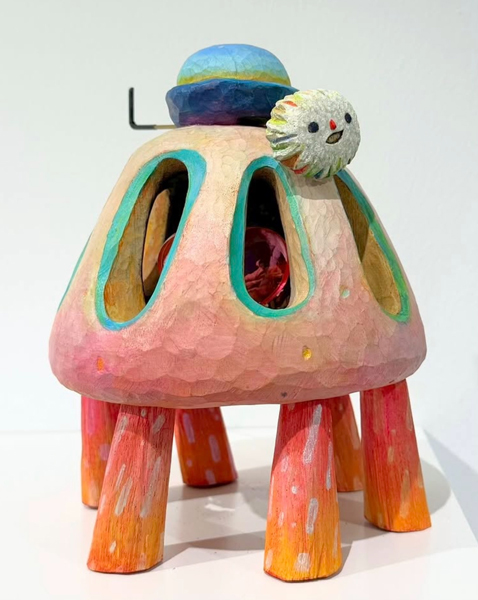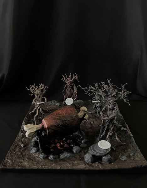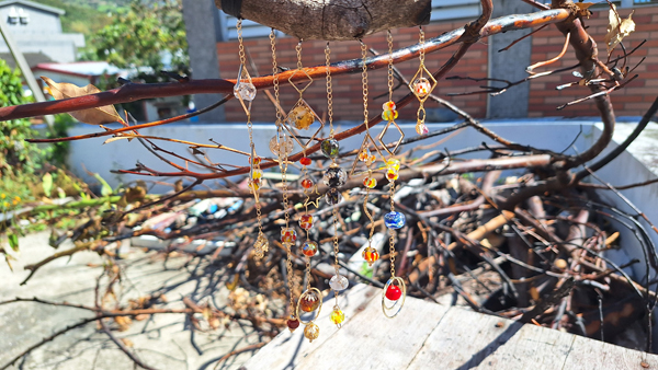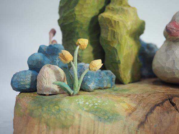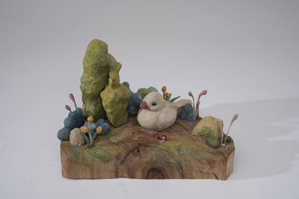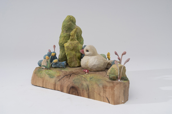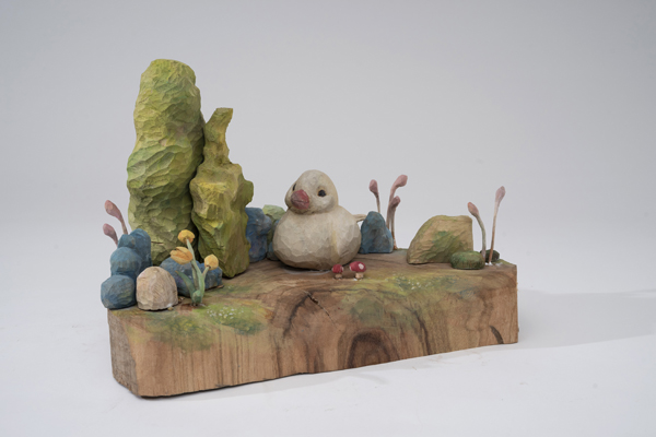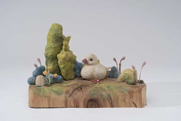 這件作品的底座是我直接選用半圓形的木頭切片,保留了木頭原本的年輪紋理,一圈一圈像是時間的痕跡,也像舞台上的幕布。我將它視為一座小劇場,圓潤的弧形如同一個溫柔的世界舞台。 花園中的場景由各種可愛澎鬆的植物與花草構成,像是從繪本中長出來的角色,它們有自己的姿態與表情,小花園能像一幕溫柔的話,帶觀者短暫逃離現實的紛擾。