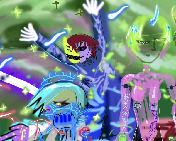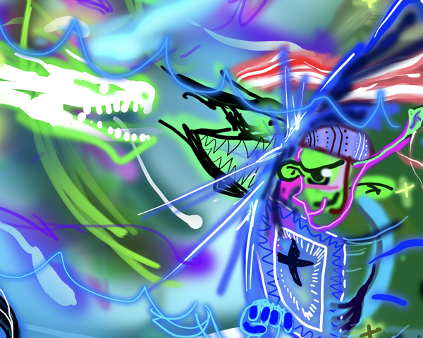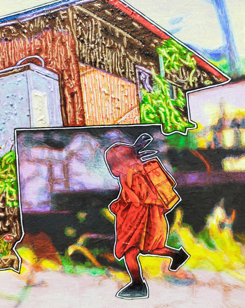 以魯本斯的同名作品為靈感,作品回應畢卡索《朝鮮大屠殺》中美國軍人對韓國平民的暴力,此作將槍手反轉置於畫面左側,以中間的海峽作為國界分野的象徵。畫面進一步轉化葛雷柯《揭開啟示錄的第五封印信》與小早川秋聲《國之楯》中的象徵人物,使其成為新角色原型;其中的婦女、孩童、哥布林不再是受難者,而被成為了蘊含能量與潛能的能動者並進行反擊。此虛構的繪畫行動試圖探問,當戰爭在虛擬的畫布上被遊戲時,我們還能如何感受力量、抵抗與其後果。