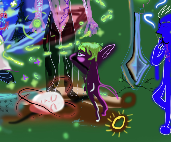在我生長的環境中是不斷被觀看著言行舉止,小孩必須不看、不聽、不說,面對長輩表情不對要改,話說錯了要改。所以長出了不能只聽見善良聲音的耳朵,還有不同人的標準聲音。我選擇曝露出人們所喜歡的乳房,讓它們並不能只是被觀看,我也要長出六對乳房來用力反擊的觀看回去。