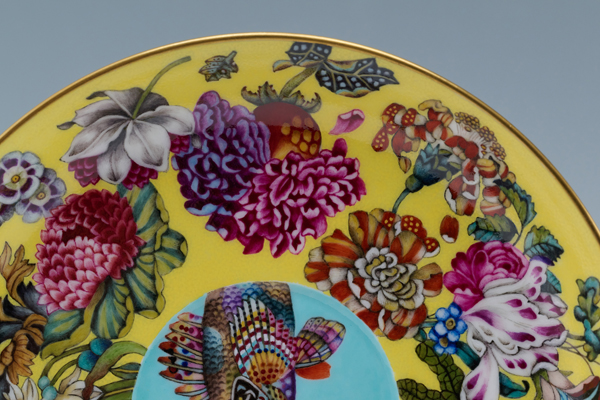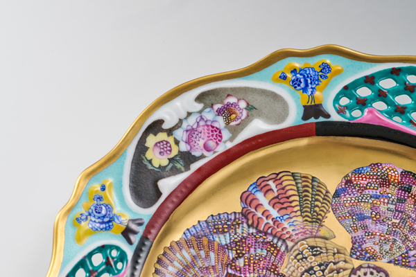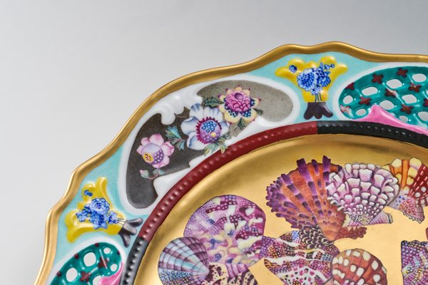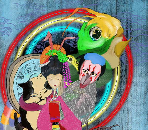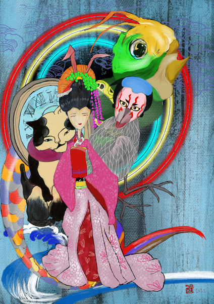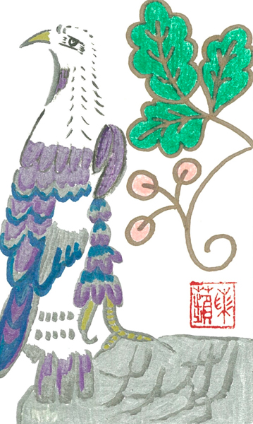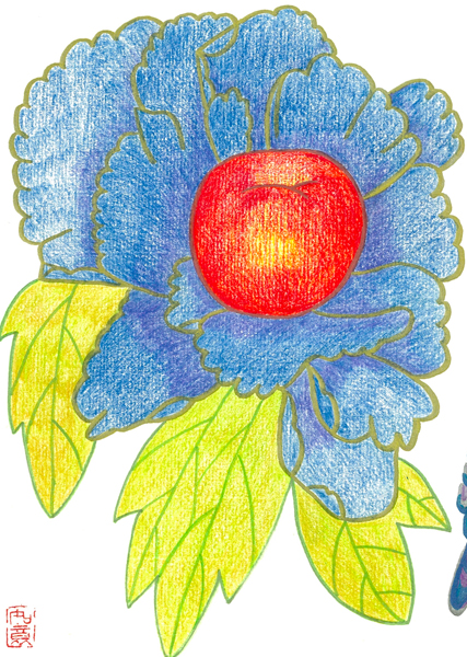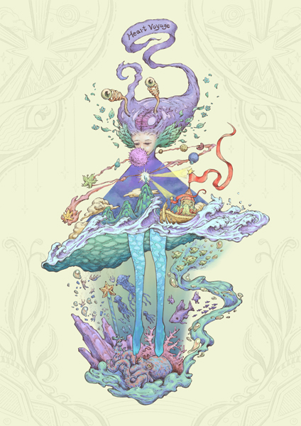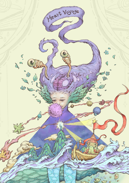 以「自然蓬勃的生命力」為核心概念,建構出融合東方意象與現代手法的視覺語境。藍色的牡丹花象徵富貴吉祥,中央的蘋果代表生命的能量,周圍的藤葉和挺立的老鷹顯現自然界的自由與守望,形成面對挫折的勇氣。上方融合日本的傳統紋樣使整體構圖增添和諧的氛圍,呈現台日文化美學在天地與精神世界的共鳴。