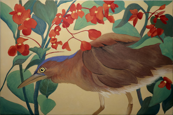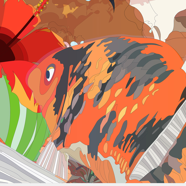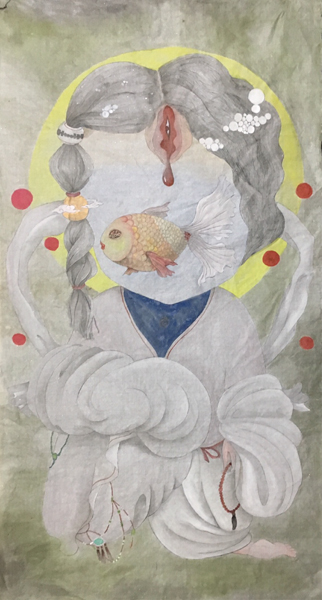 那是給自己一個蠻傳統的題目設定,參考風水畫常見的四個元素:「山、水、花、動物」,並以直式 200cm 的規格呈現。過程中,花了蠻長的時間摸索自己的創作風格和表現方式。