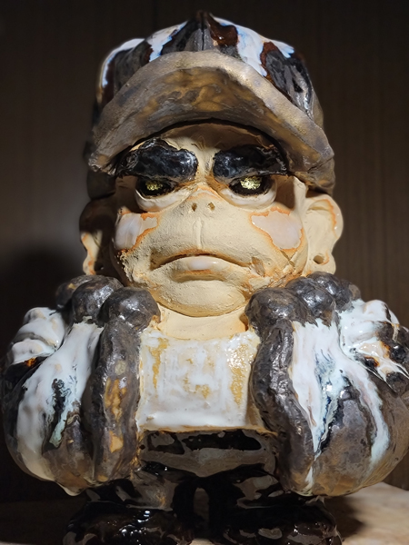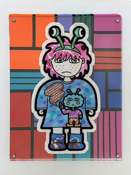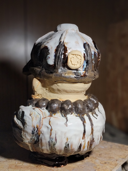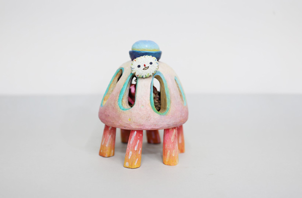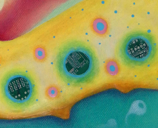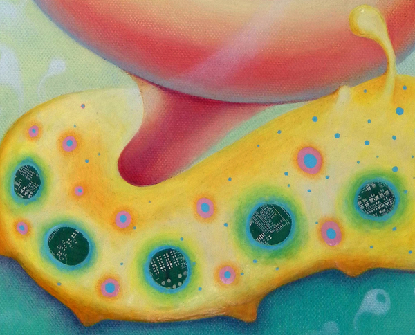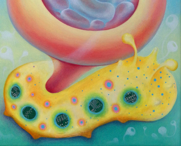 Mutanimal N°241130 以環境中的分解者為題材,運用廢棄電子板為材料,混合壓克力製作蟲 型浮雕。描繪變異的新型態物種如蕈菇與蠕蟲的變體生物,彷彿是菌類與蠕蟲兩者的共生關 係,在複雜多變的環境中,侵噬著難以化解的科技產物成為新生的力量。蕈狀生物體內部, 包覆著如種子或卵的物體,如生命的循環,正孵育著等待另一種新的生命形式誕生。