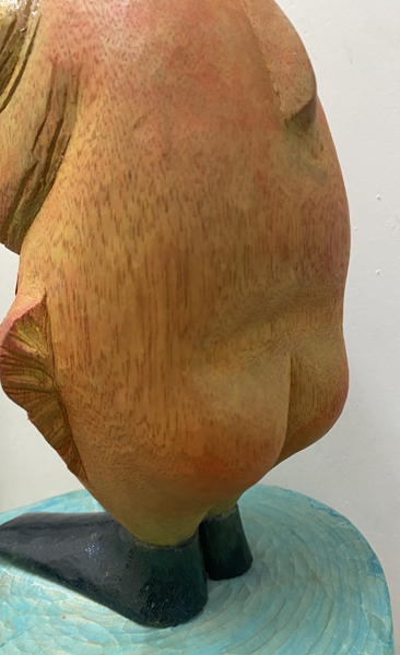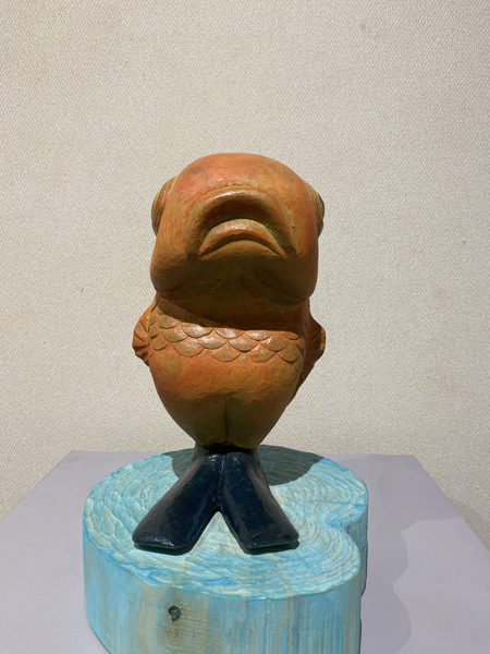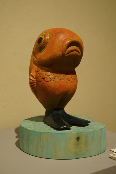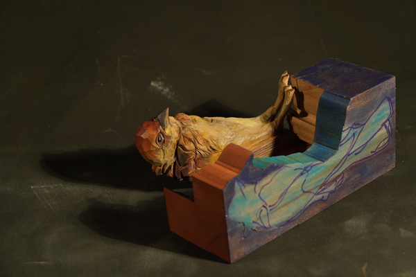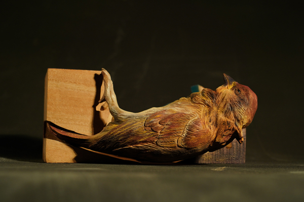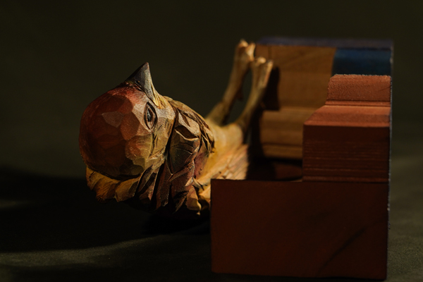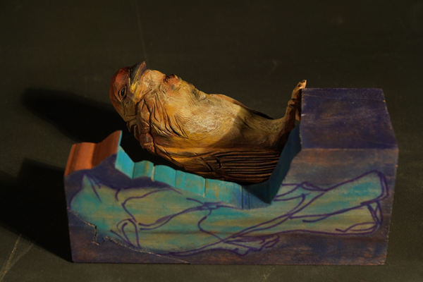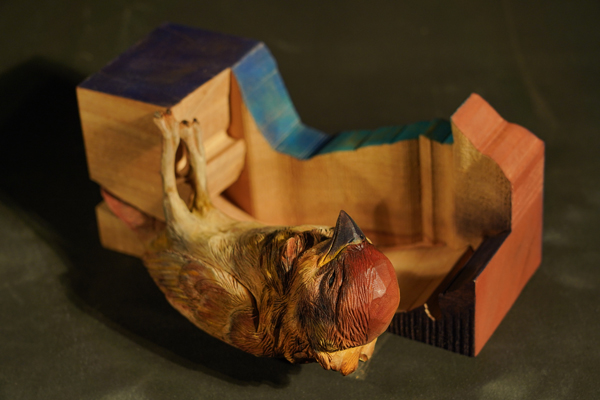 I carved its eyes unevenly—one large, one small. The large eye symbolizes the brink of death, while the small one represents the stopping of the heartbeat. The cube beside it reflects the bird’s original form at the very beginning. As I carved and gradually shaped it, the process represents its emergence into the world and eventual death, returning to the earth in a coffin. I suspended the bird at an angle within the coffin to depict the soul leaving the body—perhaps ascending to immortality, perhaps reincarnating. I hope that, in whichever form, it finds happiness.