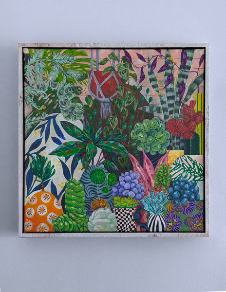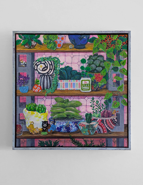 層架、盆器與日常器物並置,構成一個貼近日常的室內風景。畫面暗藏著台灣特有的生活痕跡特色; 層架不用刻意整理,但卻被長時間使用與照顧。這裡不是理想化的自然,生命(生活)而是由人與物、記憶與習慣所構成的家。