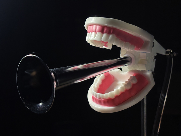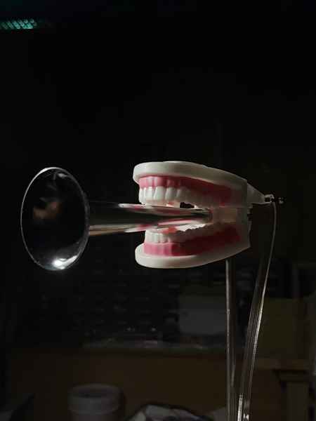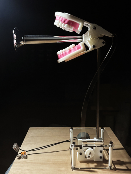 作品以馬達帶動口腔模型進行開合運作。在資料化社會中,思考被壓縮為可被記錄的機械動作,喇叭成為具象化的意識,存在不再來自內在思考,而是建立於外部系統的確認之上。