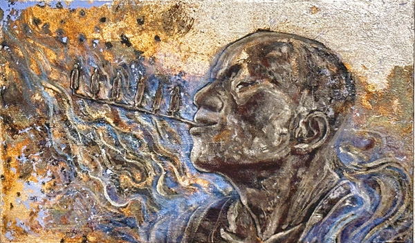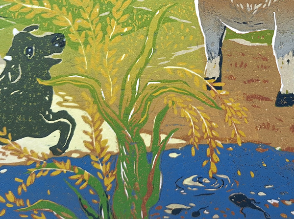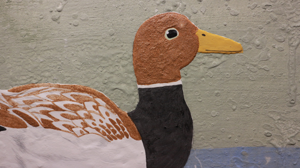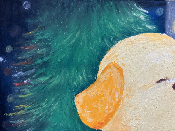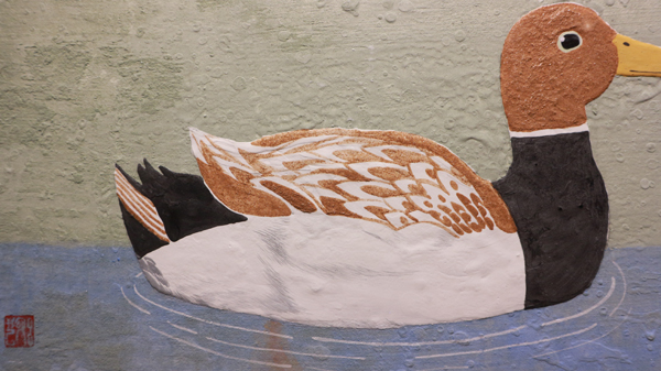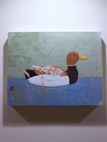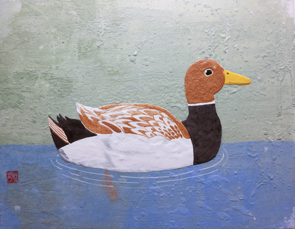在這魚龍混雜的社會,每個人都應具備怡然自得的心態。畫中自由自在的金頭鴨,正是我們在現實喧囂中所遺忘的心境,我們往往為了配合偶爾失序的社會,忘了適時調整心態,而壓抑著。透過這件作品,我期望能給觀者一份怡然自得的寧靜。
