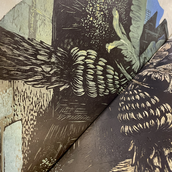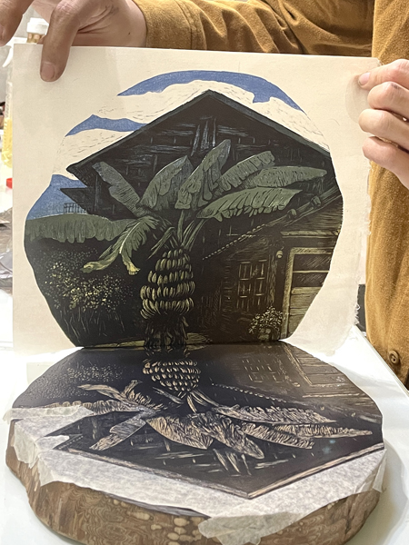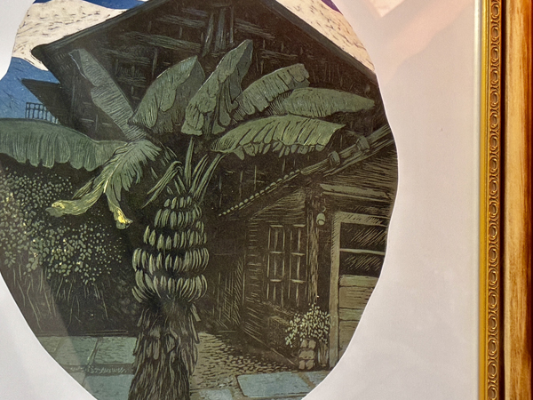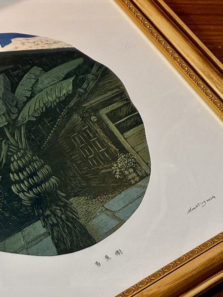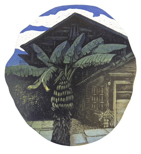 居住於台灣的敬庭學會騎機車後,如獲自由以遊歷四周。於是,他開始了創作版畫系列「晝夜巡」。在這個系列中,他嘗試以套色木口木刻,融入了鮮明的色彩,呈現不同環境中的光影交錯。「香蕉樹」就是其中一張他遊歷高雄時寫生記錄下來的日式建築風景 -
