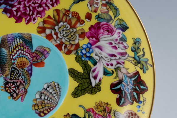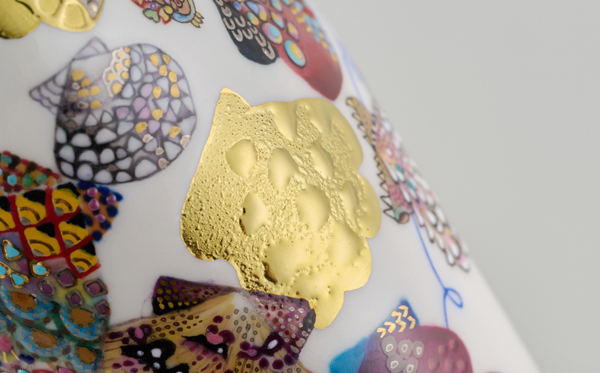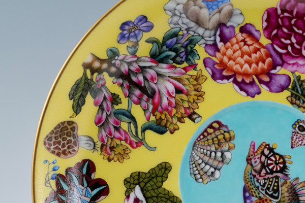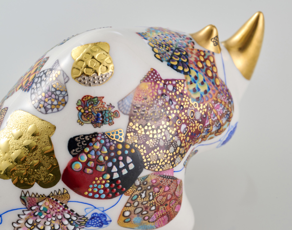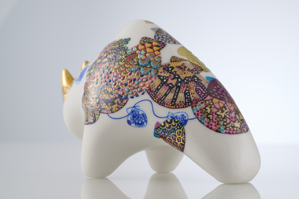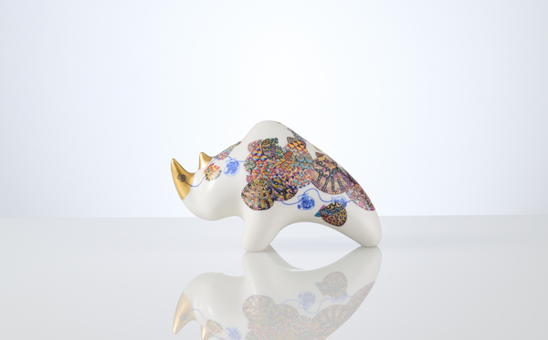 「一頭標新立異的犀牛批覆著成千上百各類錦緞扇貝,以極奢的裝扮方式對抗著公眾惡意的目光,邊奔跑邊綻現出自身雌性美麗的無所畏懼...」("An unconventional rhino draped over hundreds of brocatelle scallops, extravagantly rebellion against the nefarious public eyes and ran it's own pulchritudinous fearless...")