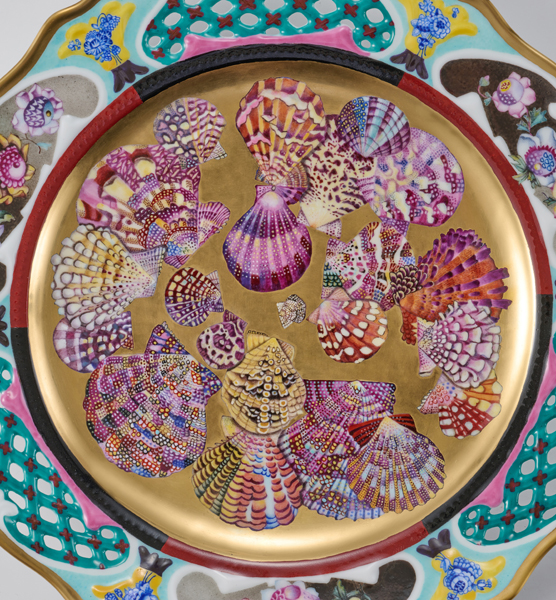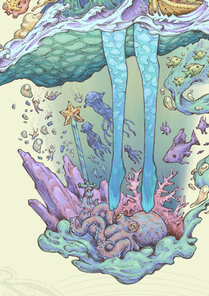 「一位富饒冒險精神的貝類學家,在燭火燃燄騷動且熾熱般的夢境中,翻倒了一批周圍環繞滿複瓣銀蓮花之珍奇古齋裡的扇貝。醒來後,他驚訝地看到無數閃閃發光的寶石…」(“An adventurous conchologist overturned the scallops of Wunderkammer in the incandescent dream amongst the double anemones. When woke up, he was surprised to see a multitude of glittering jewels…”)